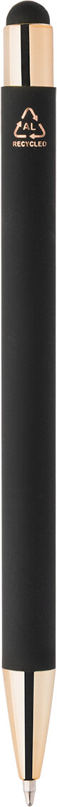Kuličkové pero z recyklovaného hliníku na dotykovou obrazovku, s černým pogumovaným tělem a barevnými lesklými kovovými částmi. Se speciálním povrchem pro zrcadlové gravírování, které ladí s kovovými částmi. S modrou náplní.