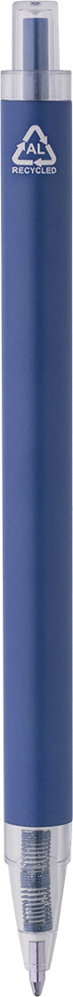 Kuličkové pero z recyklovaného hliníku s matným tělem a průhlednými RPET částmi. S modrou náplní.