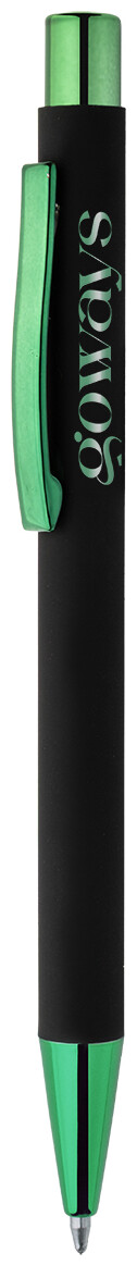 Kuličkové pero z recyklovaného hliníku s černým pogumovaným tělem a barevnými lesklými kovovými částmi. Se speciálním povrchem pro zrcadlové gravírování, které ladí s kovovými částmi. S modrou náplní.