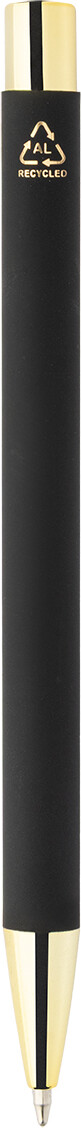 Kuličkové pero z recyklovaného hliníku s černým pogumovaným tělem a barevnými lesklými kovovými částmi. Se speciálním povrchem pro zrcadlové gravírování, které ladí s kovovými částmi. S modrou náplní.