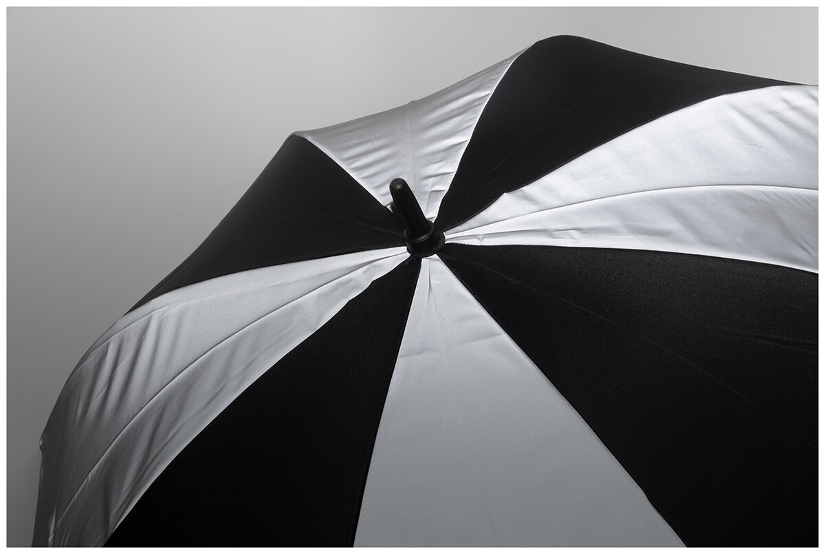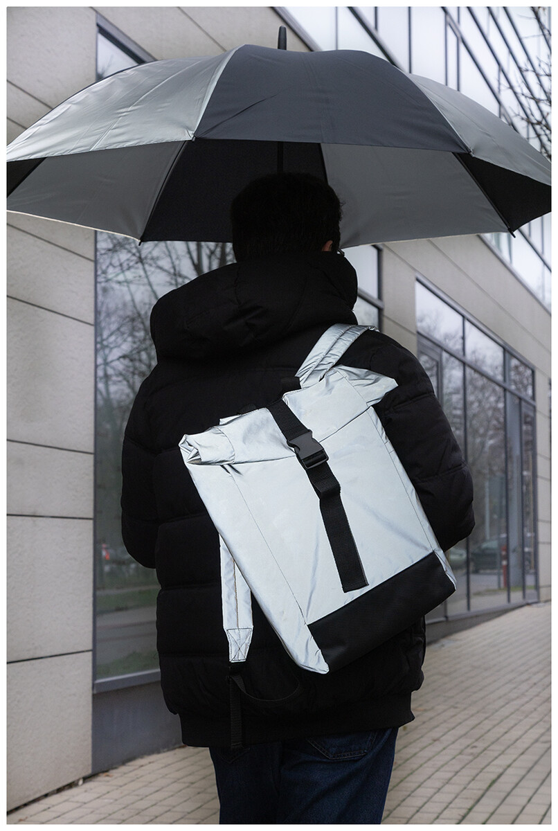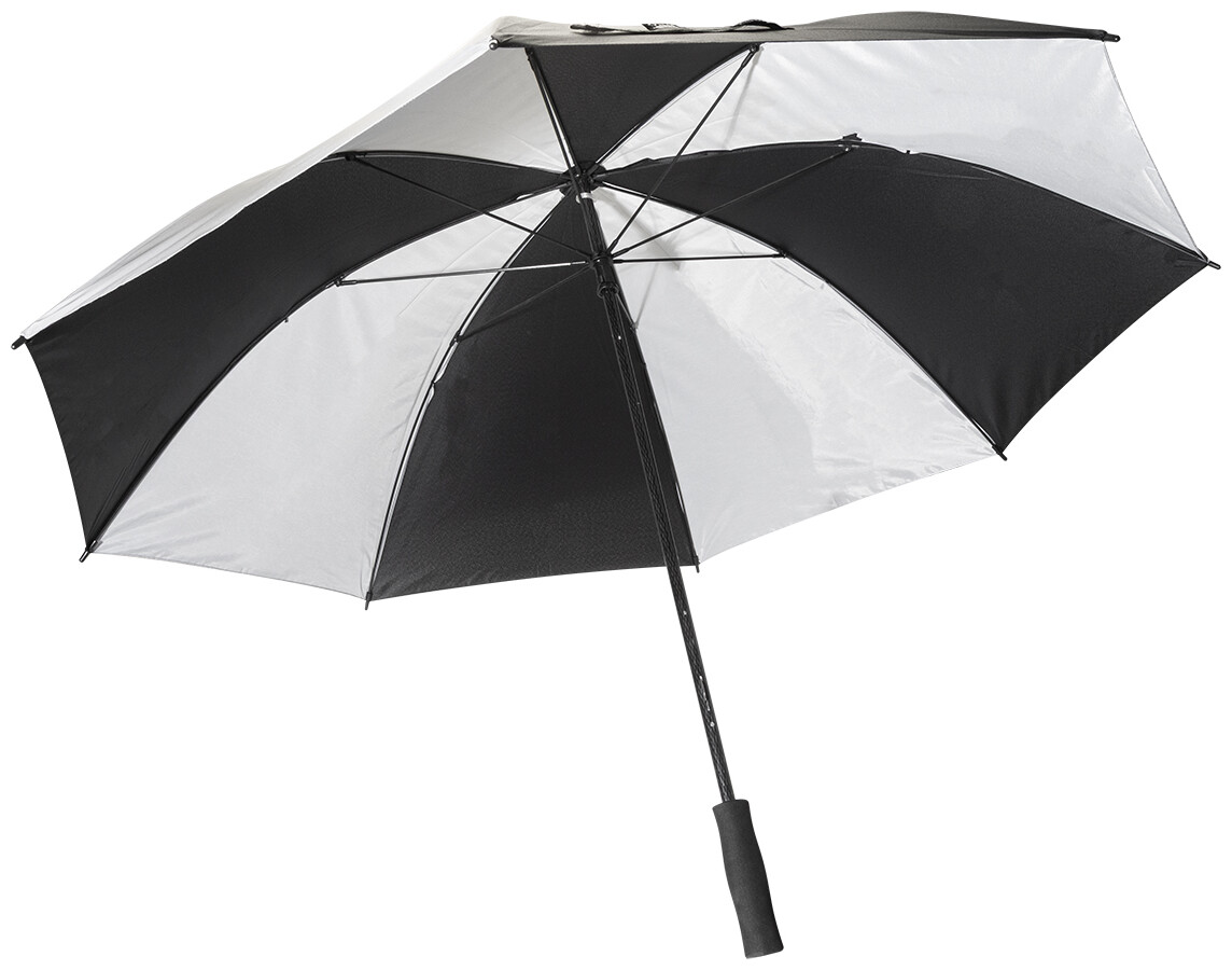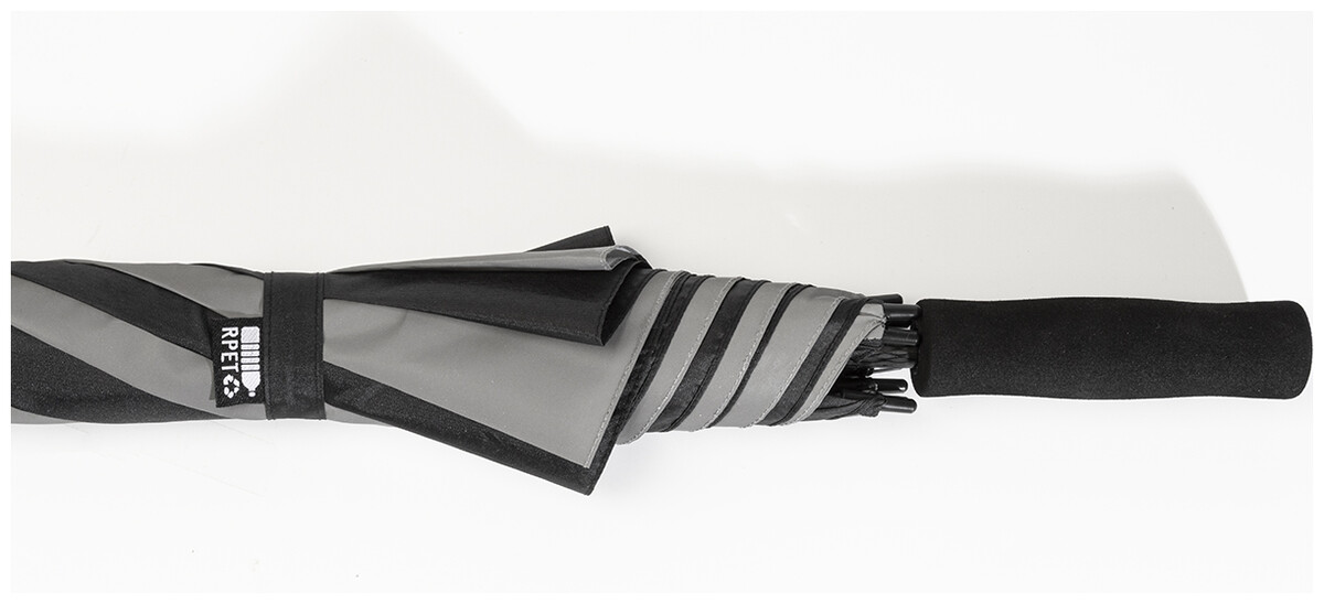 Velký, manuální větruodolný deštník se 4 panely z 190T RPET pongee a 4 panely z reflexní tkaniny. S celolaminátovým rámem a tyčí, rukojetí z EVA. 190T RPET pongee. S charakteristickým RPET štítkem.