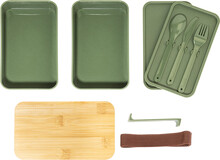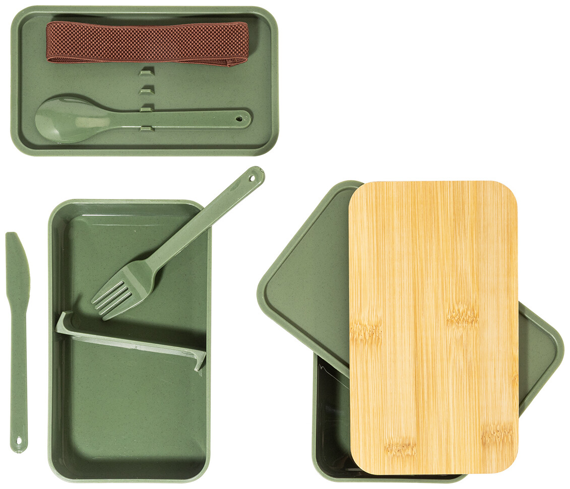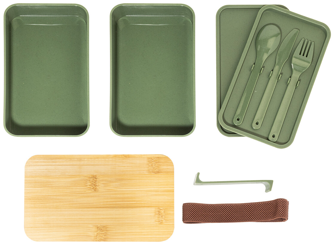 Box na jídlo z PP plastu se sadou příborů (vidlička, lžíce a nůž), bambusovým víkem a elastickým popruhem. Se 2 přihrádkami o objemu 700 ml.