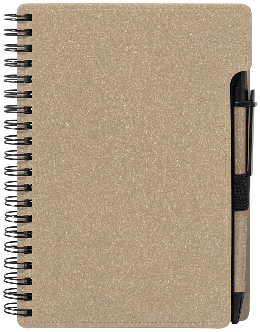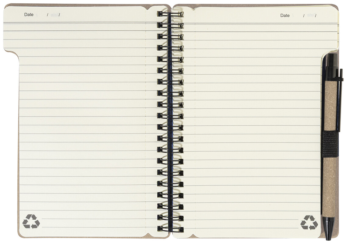 Spirálový blok A6 z recyklovaného papíru s 80 linkovanými listy. Včetně recyklovaného papíru a kuličkového pera z recyklovaného PP s modrou náplní.