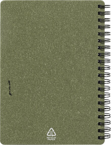 Spirálový blok A6 z recyklovaného papíru s 80 linkovanými listy. Včetně recyklovaného papíru a kuličkového pera z recyklovaného PP s modrou náplní.