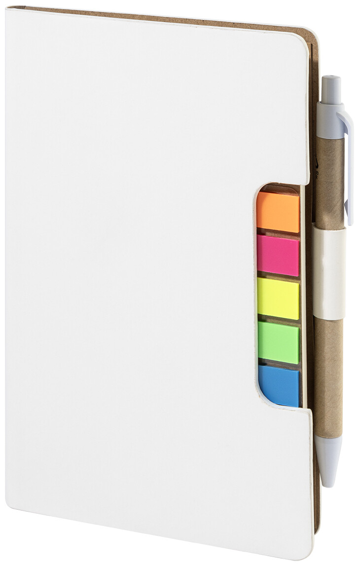 Blok s recyklovanou PU kůží, 70 linkovanými listy z recyklovaného papíru a 125 značkovači stránek (v 5 různých barvách). Včetně recyklovaného papíru a kuličkového pera z recyklovaného PP s modrou náplní.