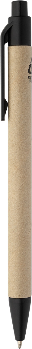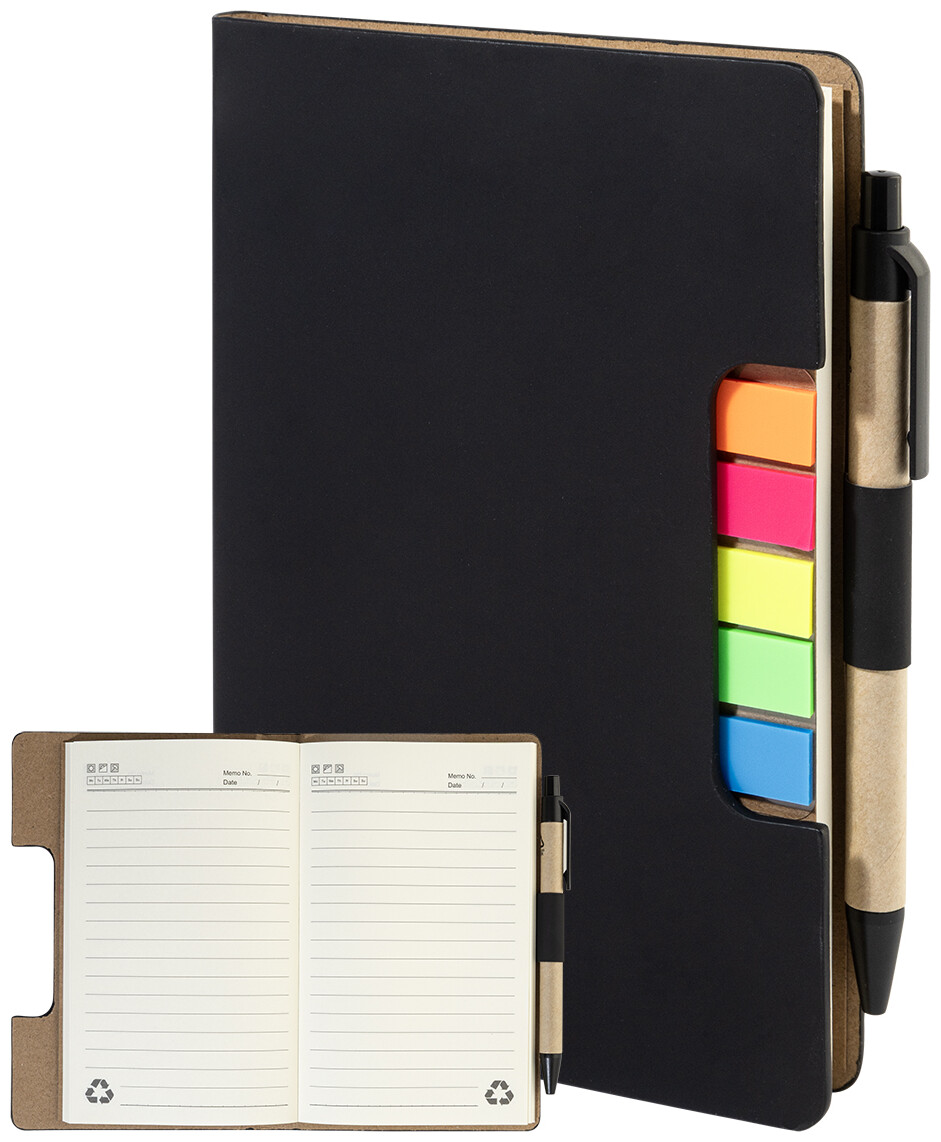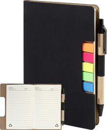 Blok s recyklovanou PU kůží, 70 linkovanými listy z recyklovaného papíru a 125 značkovači stránek (v 5 různých barvách). Včetně recyklovaného papíru a kuličkového pera z recyklovaného PP s modrou náplní.