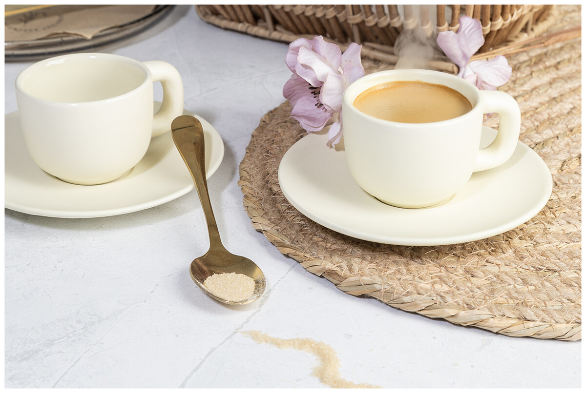 Vysoce kvalitní sada keramických šálků na espresso se 2 šálky a podšálky. S matnou vnější a lesklou vnitřní povrchovou úpravou. 85 ml. V kraftové papírové krabici.