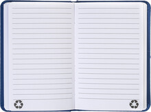 Blok potažený recyklovanou PU kůží se 100 linkovanými listy z recyklovaného papíru. Se záložkou v odpovídající barvě a gumičkou. Velikost A6.