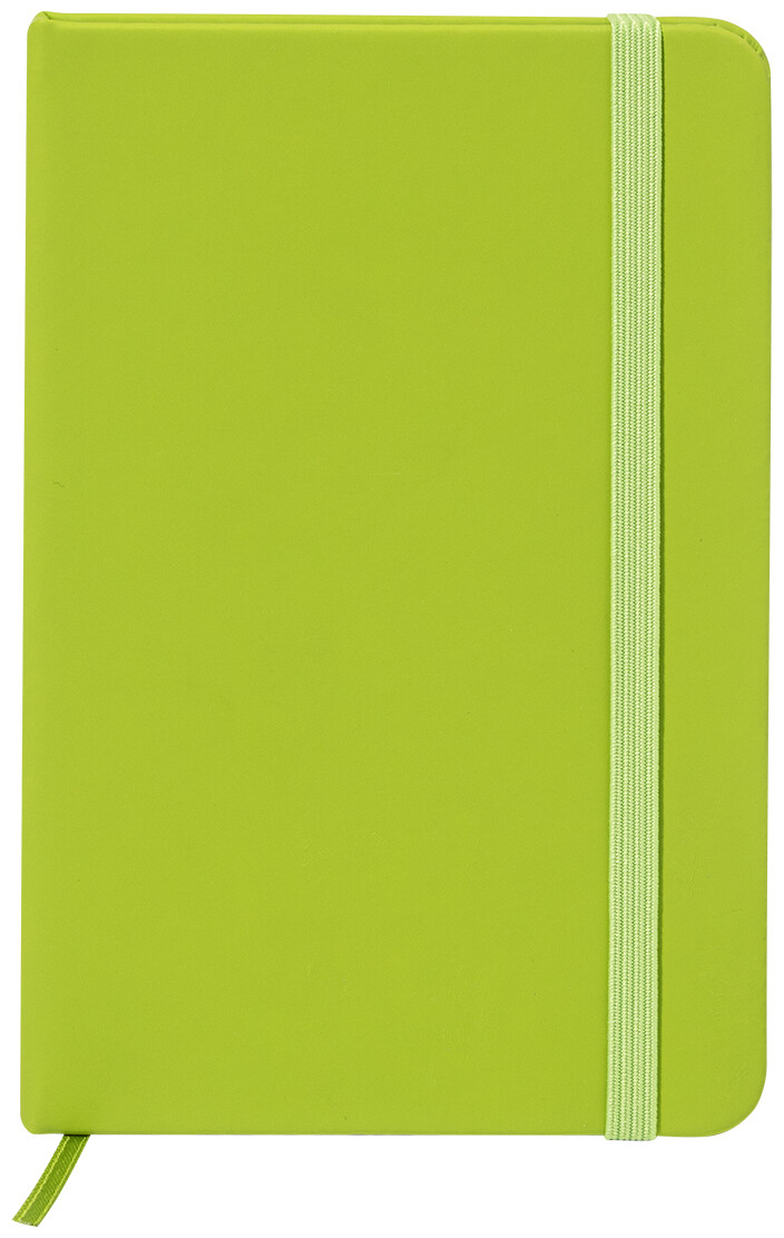 Blok potažený recyklovanou PU kůží se 100 linkovanými listy z recyklovaného papíru. Se záložkou v odpovídající barvě a gumičkou. Velikost A6.