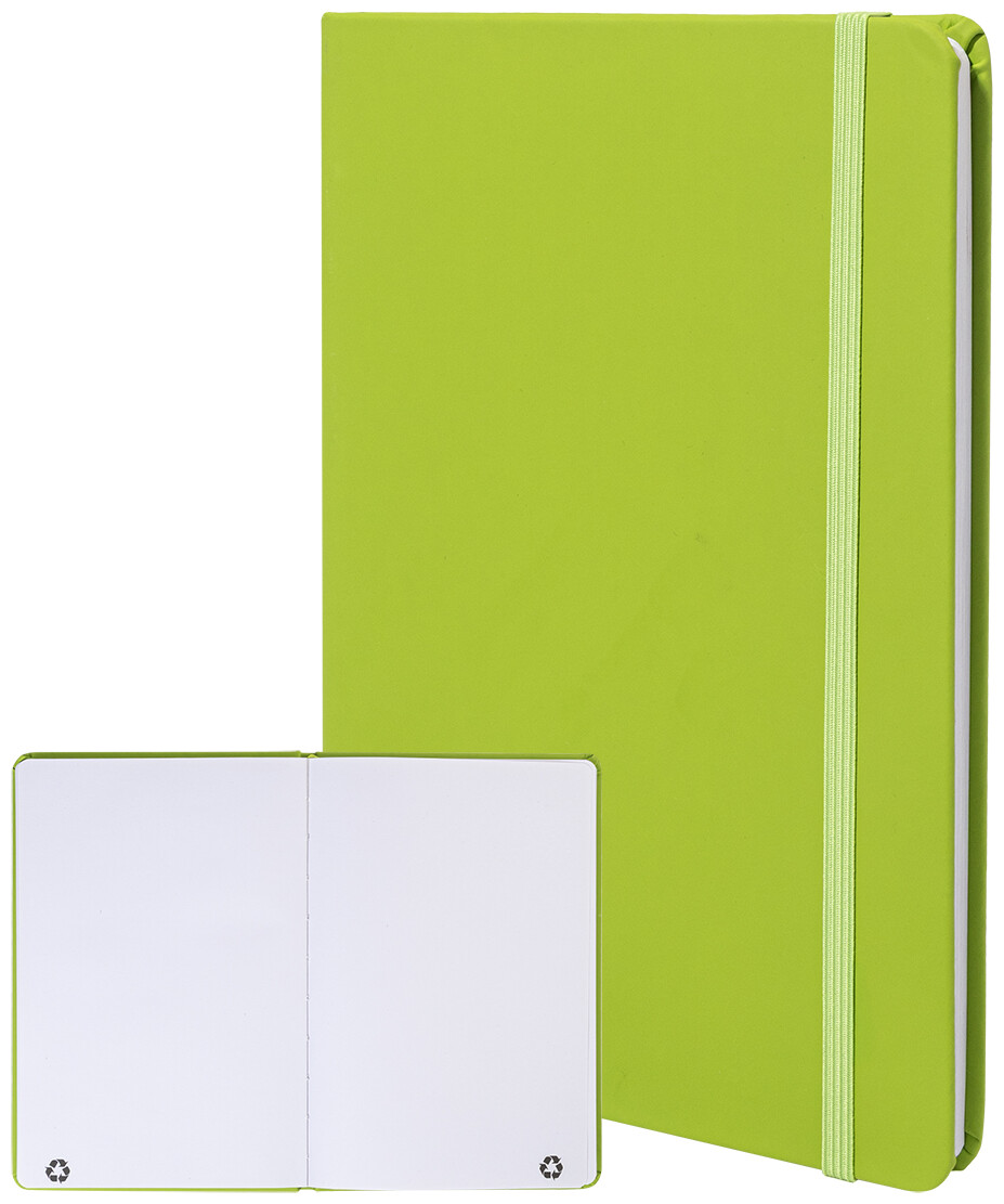 Blok A5 z recyklované PU kůže se 100 čistými listy z recyklovaného papíru. Se záložkou v odpovídající barvě a gumičkou.