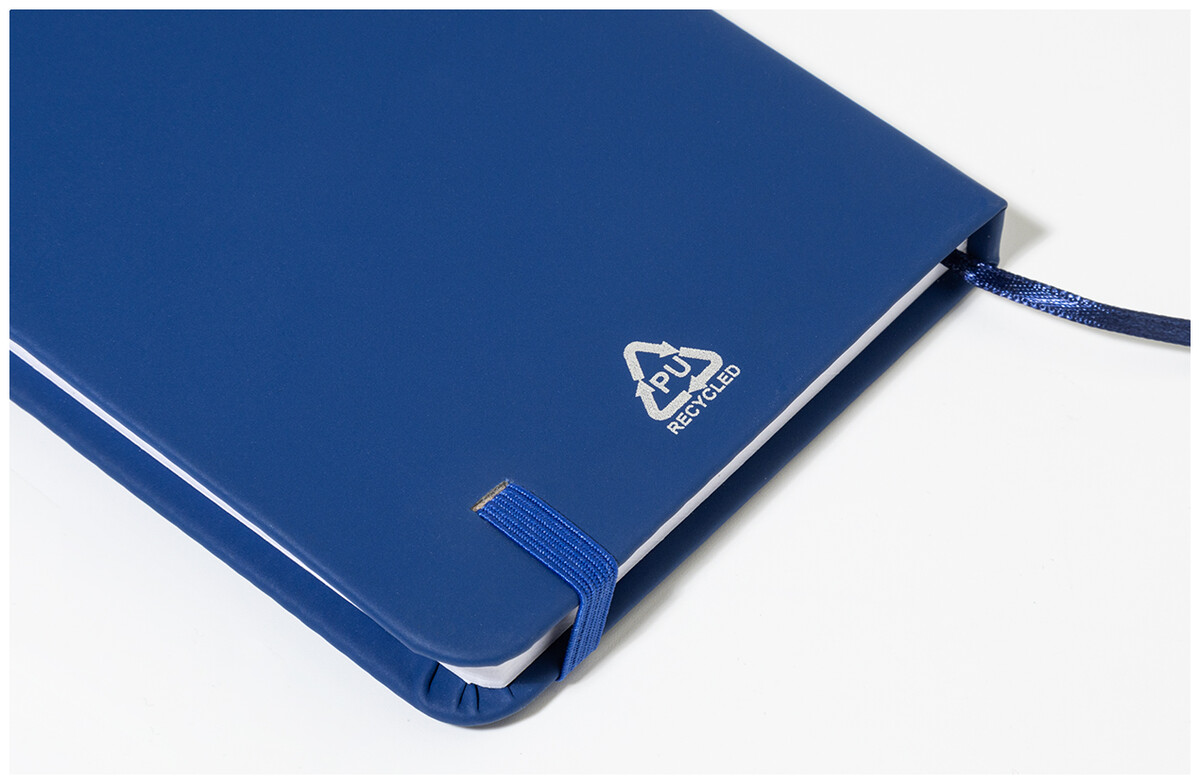 Blok A6 z recyklované PU kůže se 100 čistými listy z recyklovaného papíru. Se záložkou v odpovídající barvě a gumičkou.