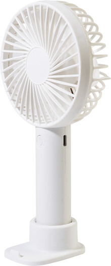 Elektrický ruční větráček z recyklovaného PP s držákem na mobilní telefon, stolním stojanem a vestavěnou dobíjecí baterií s USB portem (800 mAh). Se 3 rychlostmi. Včetně nabíjecího kabelu s USB portem.
