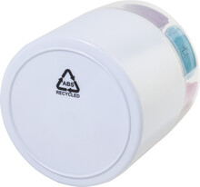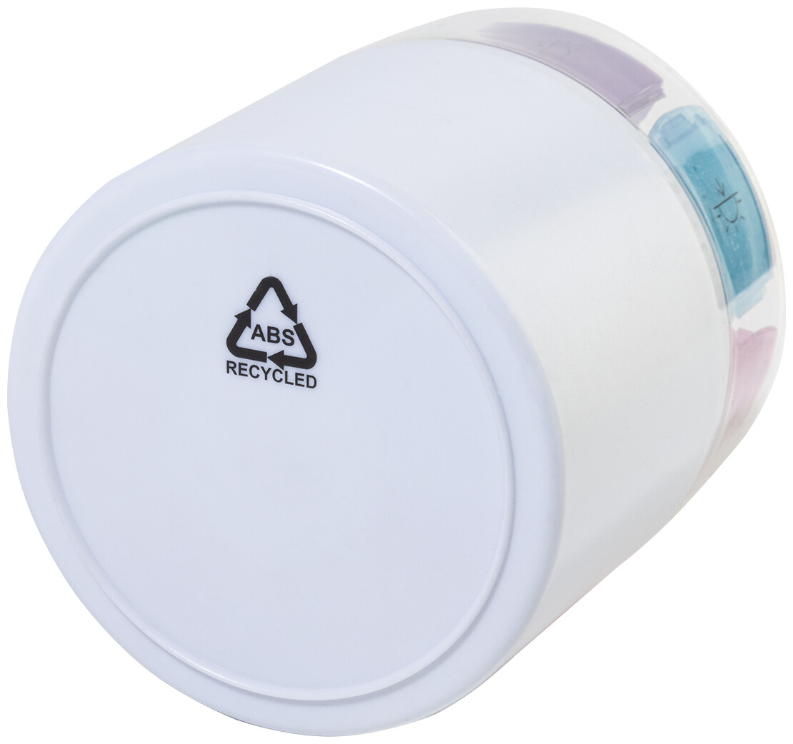Sada týdenních krabiček na léky z recyklovaného ABS plastu se 7 denními krabičkami, každá se 4 přihrádkami pro různé denní doby. V kulatém stojanu s průhledným víkem.