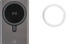 Power banka z recyklovaného hliníku s vestavěnou magnetickou bezdrátovou rychlonabíječkou (15 W) a 5000 mAh baterií. Se vstupem USB-C a portem pro nabíječku. Obsahuje samolepicí kovový kroužek pro použití magnetické funkce na jakémkoli bezdrátovém nabíjecím zařízení. Kompatibilní s iPhone® 12 nebo novějším. USB nabíjecí kabel součástí.