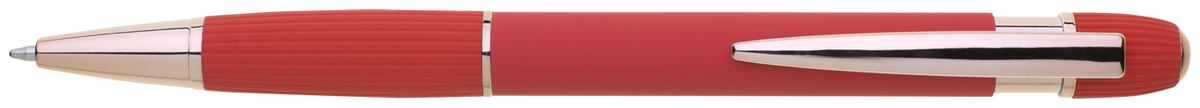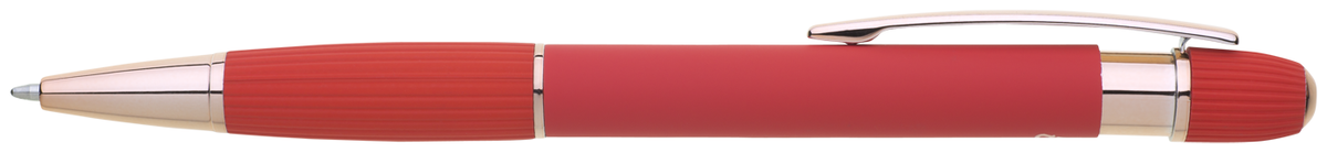 Kovová propiska se soft povrchem a doplňky v růžovo-zlaté barvě. Laserované logo je lesklé, růžovo-zlaté. Náplň modře píšící. Výsledný efekt laserového značení je lesklý, v barvě doplňků.