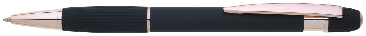 propiska z recyklovaného hliníku se soft povrchem a doplňky v růžovo-zlaté barvě. Laserované logo je lesklé, růžovo-zlaté. Náplň modře píšící. Výsledný efekt laserového značení je lesklý, v barvě doplňků.