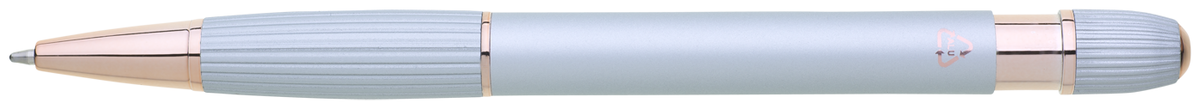 Propiska z recyklovaného hliníku se soft povrchem a doplňky v růžovo-zlaté barvě. Laserované logo je lesklé, růžovo-zlaté. Náplň modře píšící. Výsledný efekt laserového značení je lesklý, v barvě doplňků.