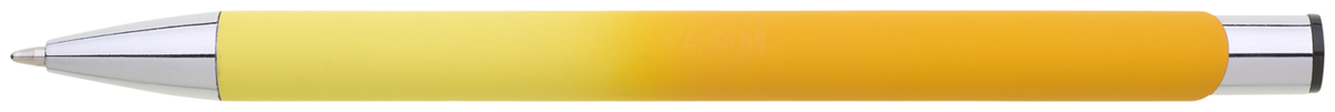 Hliníková propiska se stříbrnými doplňky a měkkým pogumovaným soft povrchem ve světle žluto–tmavě žlutém přechodu. Náplň velkoobsahová, modře píšící