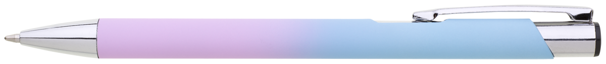 Hliníková propiska se stříbrnými doplňky a měkkým pogumovaným soft povrchem ve růžovo–světle modrém přechodu. Náplň velkoobsahová, modře píšící.