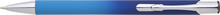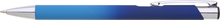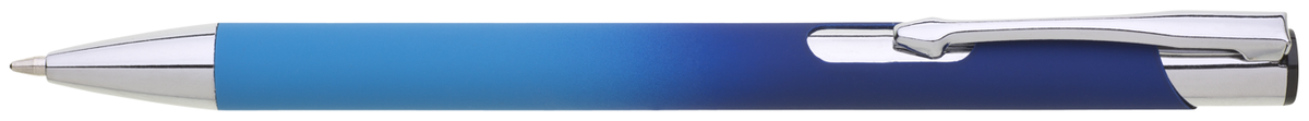 Hliníková propiska se stříbrnými doplňky a měkkým pogumovaným soft povrchem v tyrkysovo–tmavě modrém přechodu. Náplň velkoobsahová, modře píšící.