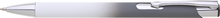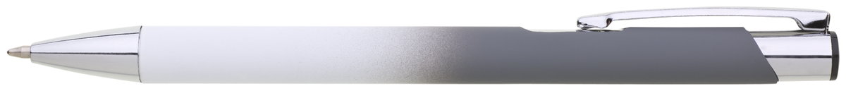 Hliníková propiska se stříbrnými doplňky a měkkým pogumovaným soft povrchem v bílo-šedém přechodu. Náplň velkoobsahová, modře píšící.