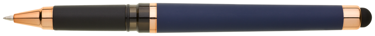 Gelová propiska s s víčkem a touch koncem, soft povrch a doplňky v růžovo-zlaté barvě. Náplň gelová velkokapacitní modře píšící.