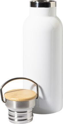 Dvoustěnná, vakuově izolovaná láhev z recyklované nerezové oceli pro sublimační tisk s bambusovým víčkem. 500 ml.