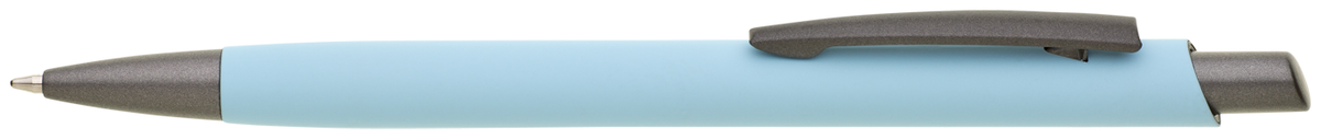LIVOX SOFT RE – kovová propiska s pogumovaným soft povrchem z recyklovaného hliníku. Propiska má matné šedé doplňky. Náplň velkoobsahová, modře píšící.