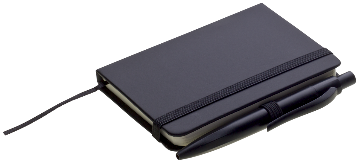 Zápisník A7 v černých deskách z PU materiálu má 80 linkovaných listů. Blok má uzavírací gumičku, poutko na propisku a textilní záložku v barvě desekSoučástí bloku je propiska připevněná na přinýtovaném poutku.