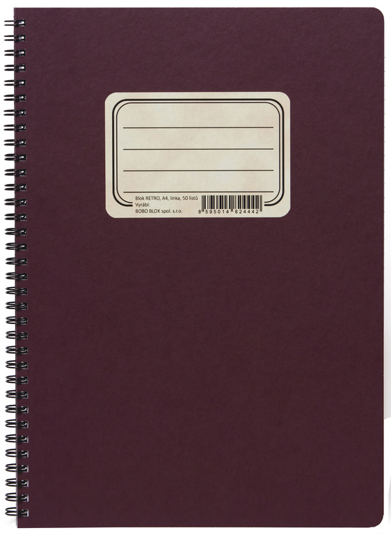 Blok s boční kroužkovou vazbou, tvrdými deskami v RETRO designu, 50 listů. Formát: A4, linkovaný.