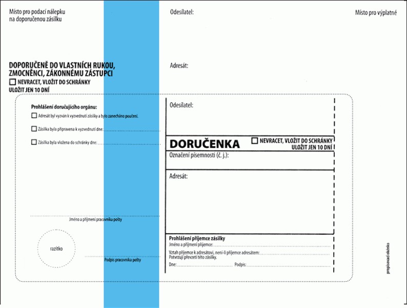 Samolepící s krycí páskou, modrý pruh, s poučením, správní řád.