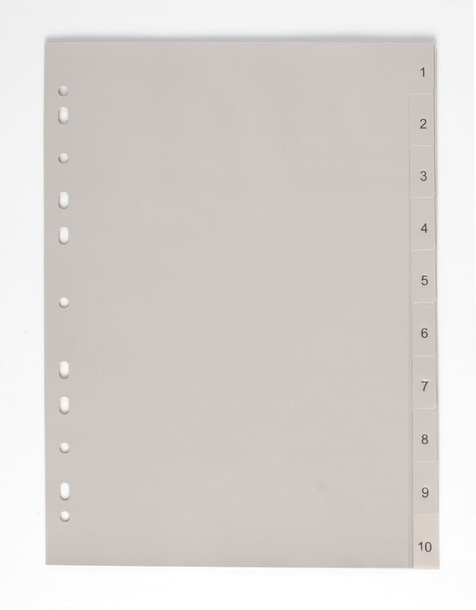 Rozdružovač, rozlišovač nebo rejstřík. Praktická pomůcka pro oddělování dokumentů, rejstřík 1-10, formát A4, šedá barva. Vhodné k zavěšení do pořadače. Polypropylen, síla 120 mikronů
