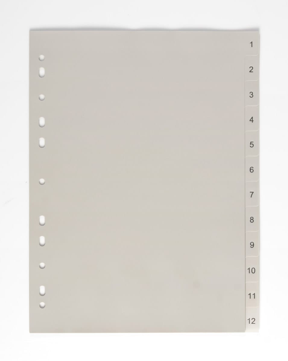 Rozdružovač, rozlišovač nebo rejstřík. Praktická pomůcka pro oddělování dokumentů, rejstřík 1-12, formát A4, šedá barva. Vhodné k zavěšení do pořadače. Polypropylen, síla 120 mikronů