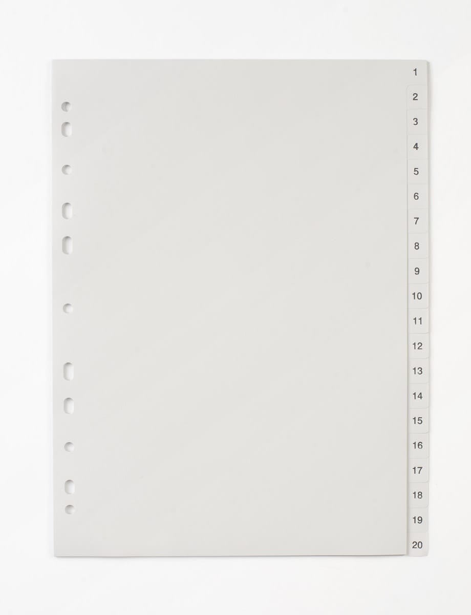 Rozdružovač, rozlišovač nebo rejstřík. Praktická pomůcka pro oddělování dokumentů, rejstřík 1-20, formát A4, šedá barva. Vhodné k zavěšení do pořadače. Polypropylen, síla 120 mikronů