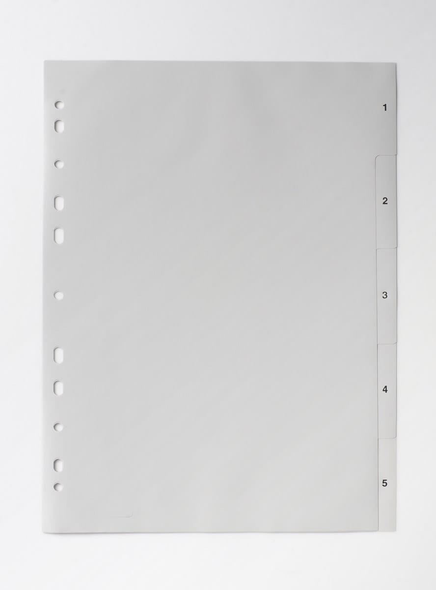 Rozdružovač, rozlišovač nebo rejstřík. Praktická pomůcka pro oddělování dokumentů, rejstřík 1-5, formát A4, šedá barva. Vhodné k zavěšení do pořadače. Polypropylen, síla 120 mikronů
