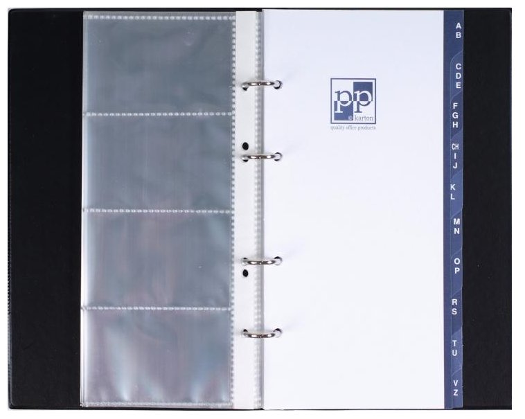 Kroužkový vizitkář formátu 1/2 A4 na 80 ks vizitek s indexem A-Z. Kapsy jsou součástí balení. Materiál XEPTR. Barva: černá.