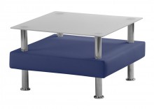 stolek s deskou z netříštivého skla, čalouněný korpus, chromované nohy, zatížitelnost vrchní desky 20 kg, záruka 36 měsíců, český výrobek, 62*62 cm* výška 39 cm