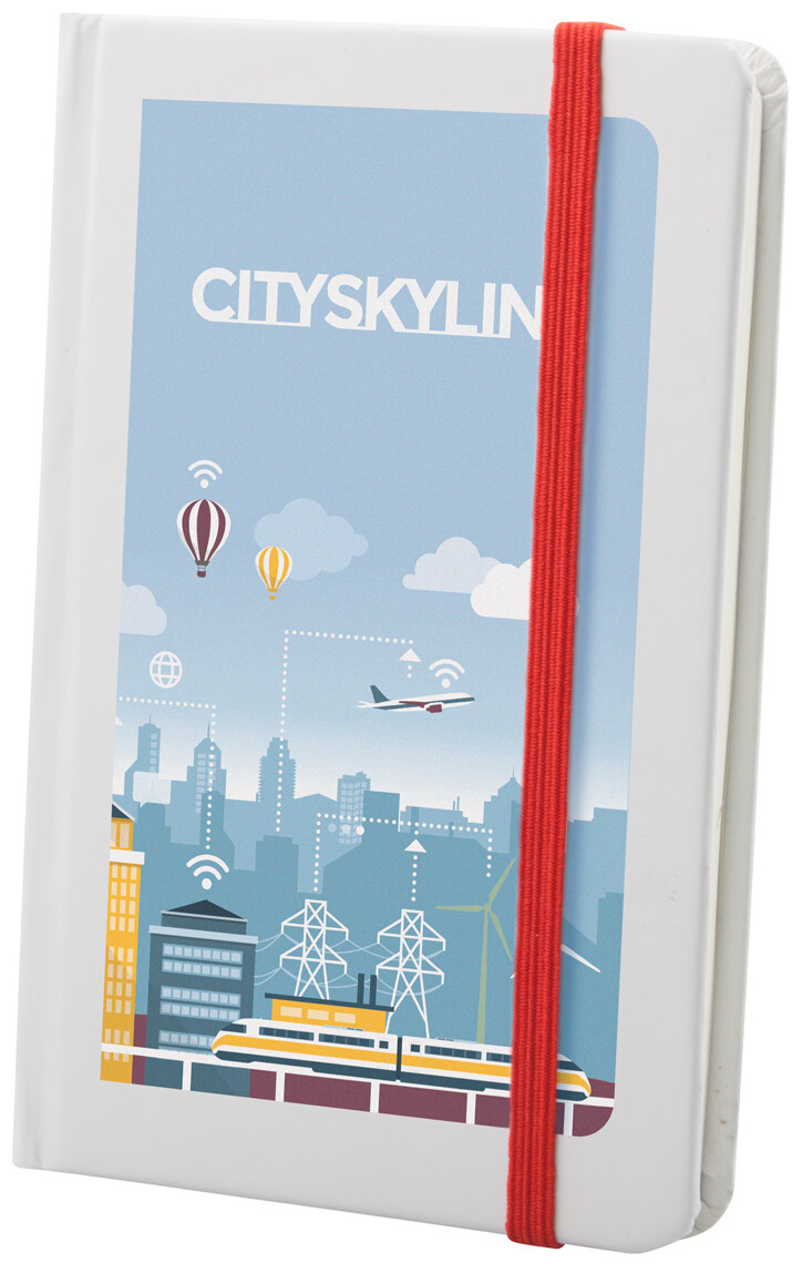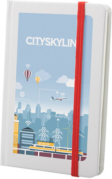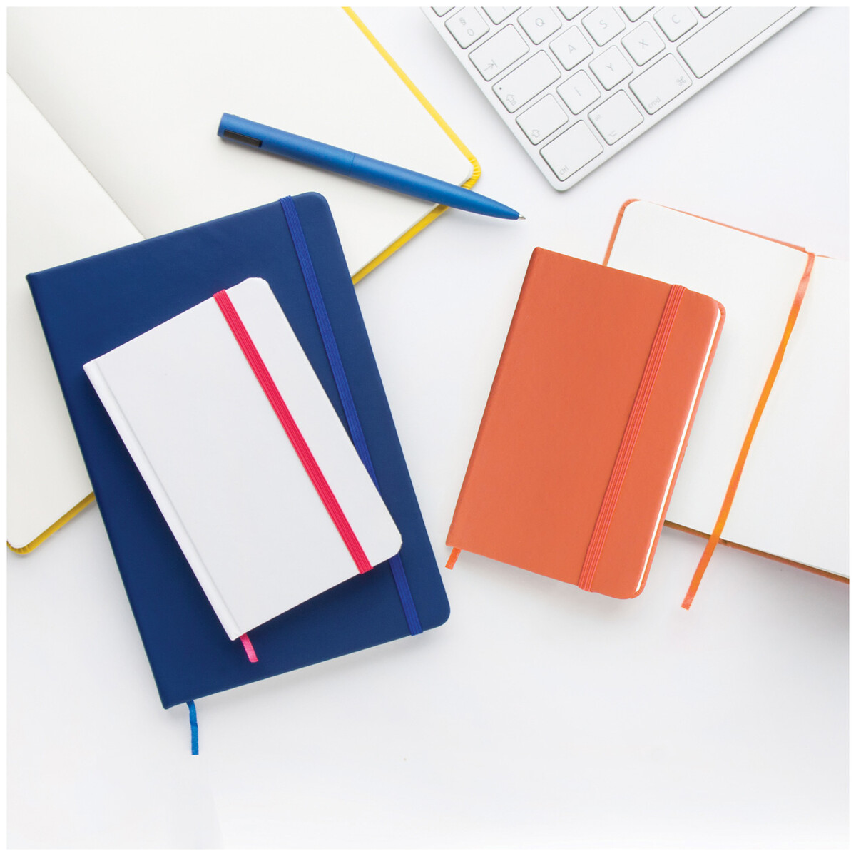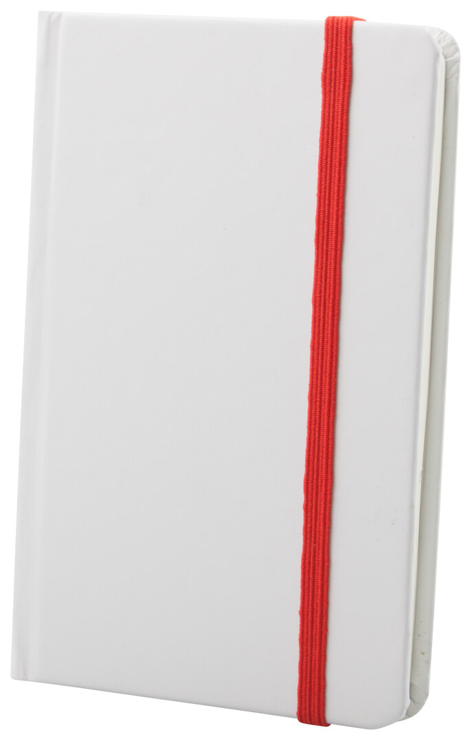 Poznámkový blok s bílými deskami, 80 čistými listy a barevnou gumičkou. Velikost A6.