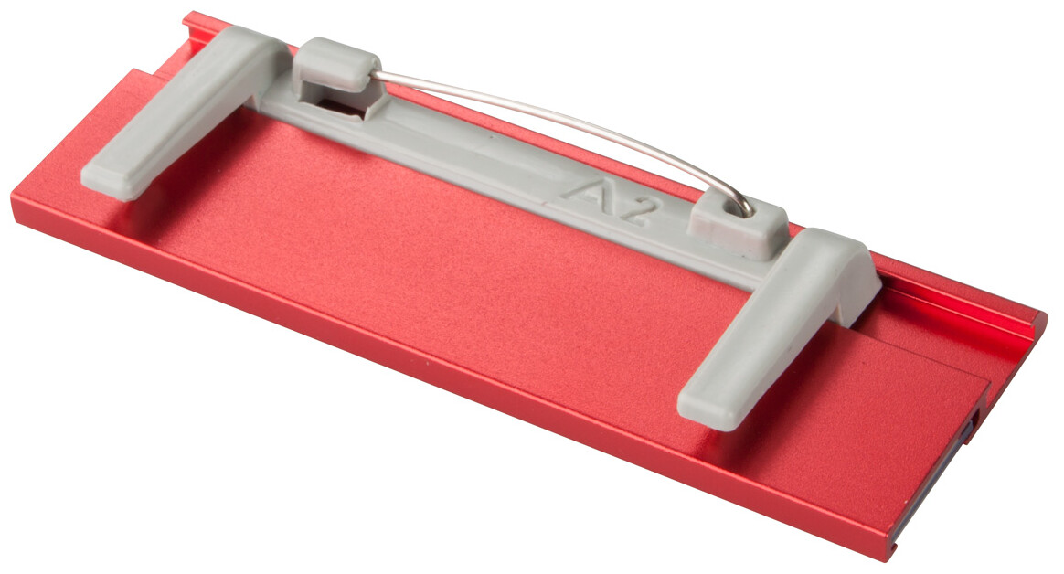 Hliníková jmenovka s vyměnitelnými papírovými a plastovými díly.