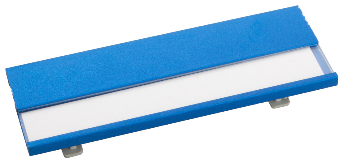 Hliníková jmenovka s vyměnitelnými papírovými a plastovými díly.