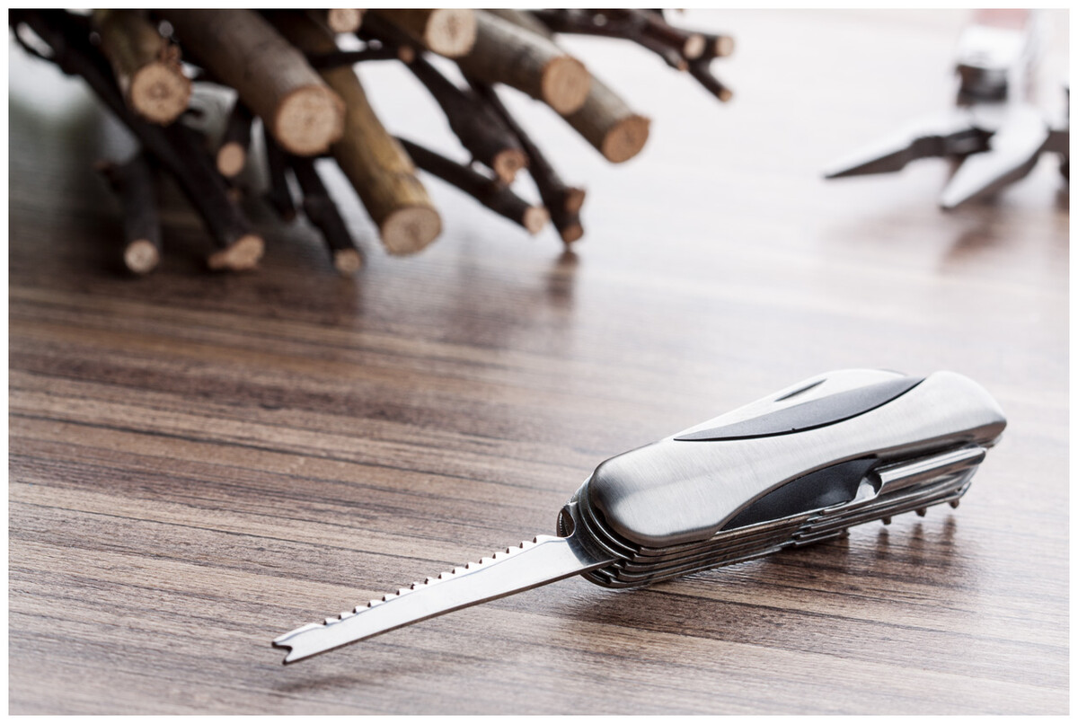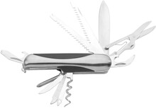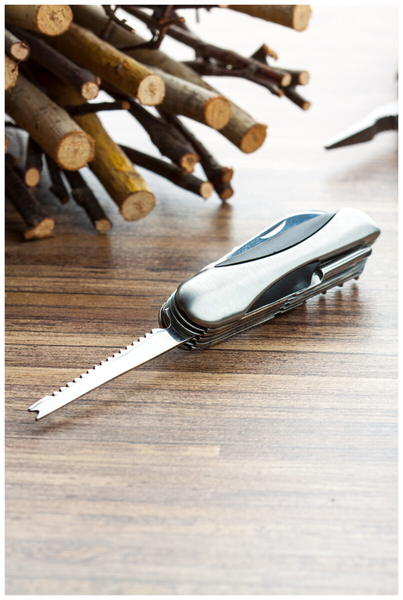 Kovový kapesní nůž s 11ti funkcemi a plastovou ozdobou.