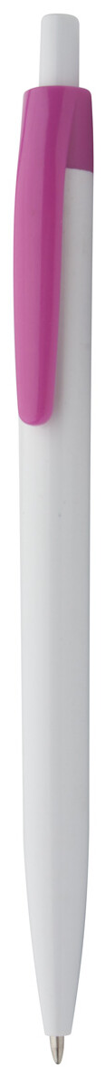 Plastové kuličkové pero s bílým tělem a barevným klipem, s modrou náplní.