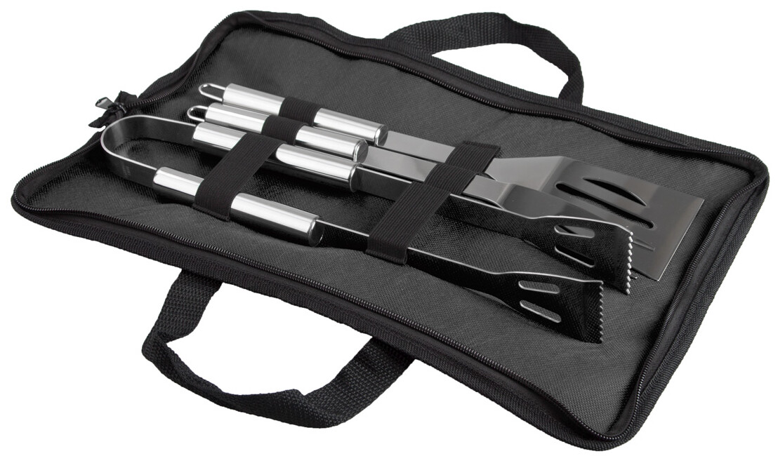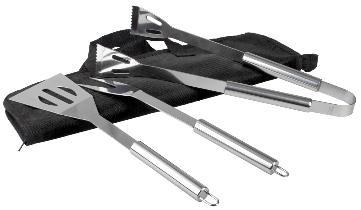 3 ks - sada na grilování z nerezové oceli (vidlička, lopatka a kleště) nylonová taška se zipem.