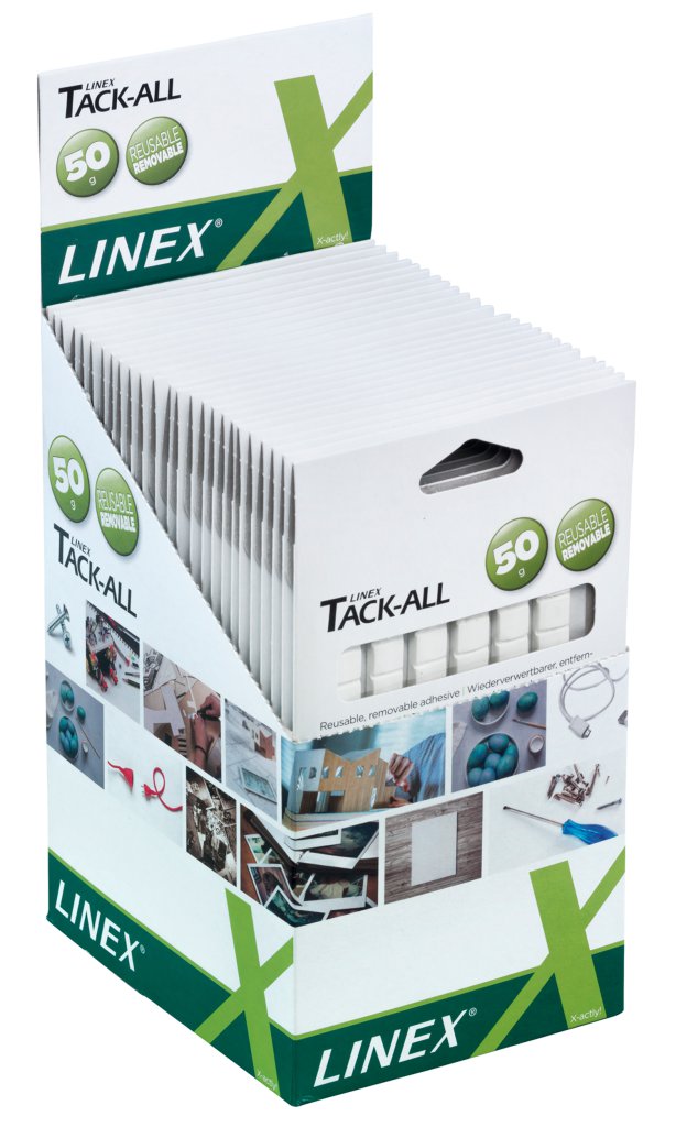 Tato hmota typu Tack-All (např. Linex nebo Bantex) je ekologická alternativa k lepicím páskám a lze ji znovu použít po omytí vodou