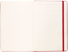 Zápisník RECORD A5 v červených deskách má 80 listů, vpravo linkovaného, vlevo čistého papíru v barvě slonové kosti. Blok má uzavírací gumičku a textilní záložku v barvě desek, na vnitřních zadních deskách vlepenou papírovou kapsu na poznámky.