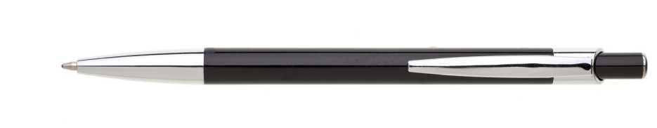 Kovová černá propiska s lesklým povrchem a charakteristickou protáhlou špičkou. Špička i klip jsou pochromované.