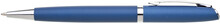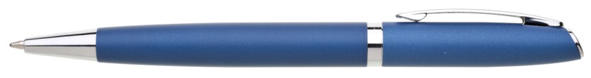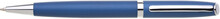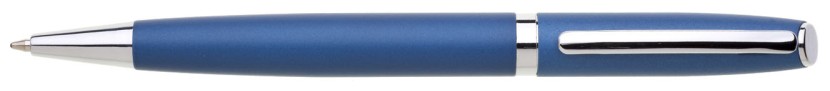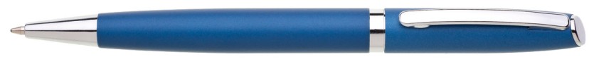 Hliníková propiska TORICO s otočným mechanismem v barvě matně modré a stříbrnými doplňky. Náplň velkoobsahová, modře píšící.