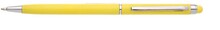 Plastové, kuličkové pero s tenkým, žlutým tělem a s chromovými doplňky. Pero má otočný mechanismus a na konci těla touch pro dotykové displeje v barvě těla. Náplň X 20, modře píšící.