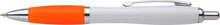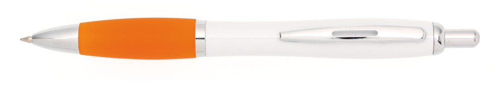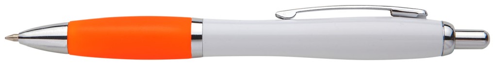 Plastové propisovací pero JESI s bílým tělem. Barva pogumovaného úchopu je oranžová. Ostatní doplňky jsou stříbrné. Náplň je velkoobsahová, modře píšící.