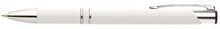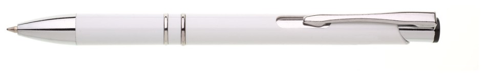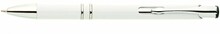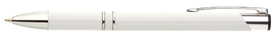 Plastové propisovací pero OIRA - bílé. Pero je zdobené dvěma stříbrnými proužky. Na těle je zdobeno oválným výřezem. Pero má náplň velkoobsahovou, modře píšící.